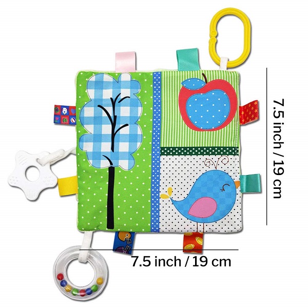 Made for Baby: The baby taggie comforter blanket is about 7.5 x 7.5 inches (19 x 19 cm), a perfect and convenient size for your cute little one to grasp and carry around wherever he or she goes, offering a soothing sense of security no matter the place. The blanket includes flexible loop for attaching to stroller and cribThis soft comforter measures different size and has knotted corners that are fun for babies to handle and chew on. Our baby comforters are well-designed with lovely patterns, decorated with colorful tags that make your baby fondle admiringly. It is a lovely baby comforter toys that help baby to sleeping quickly, and super soft simulating the feeling of being held, touched, and cuddled. The variety of soft textures and vivid features will stimulate your baby's curious and sensory experience, and help to train your baby cognitive color and small animals.